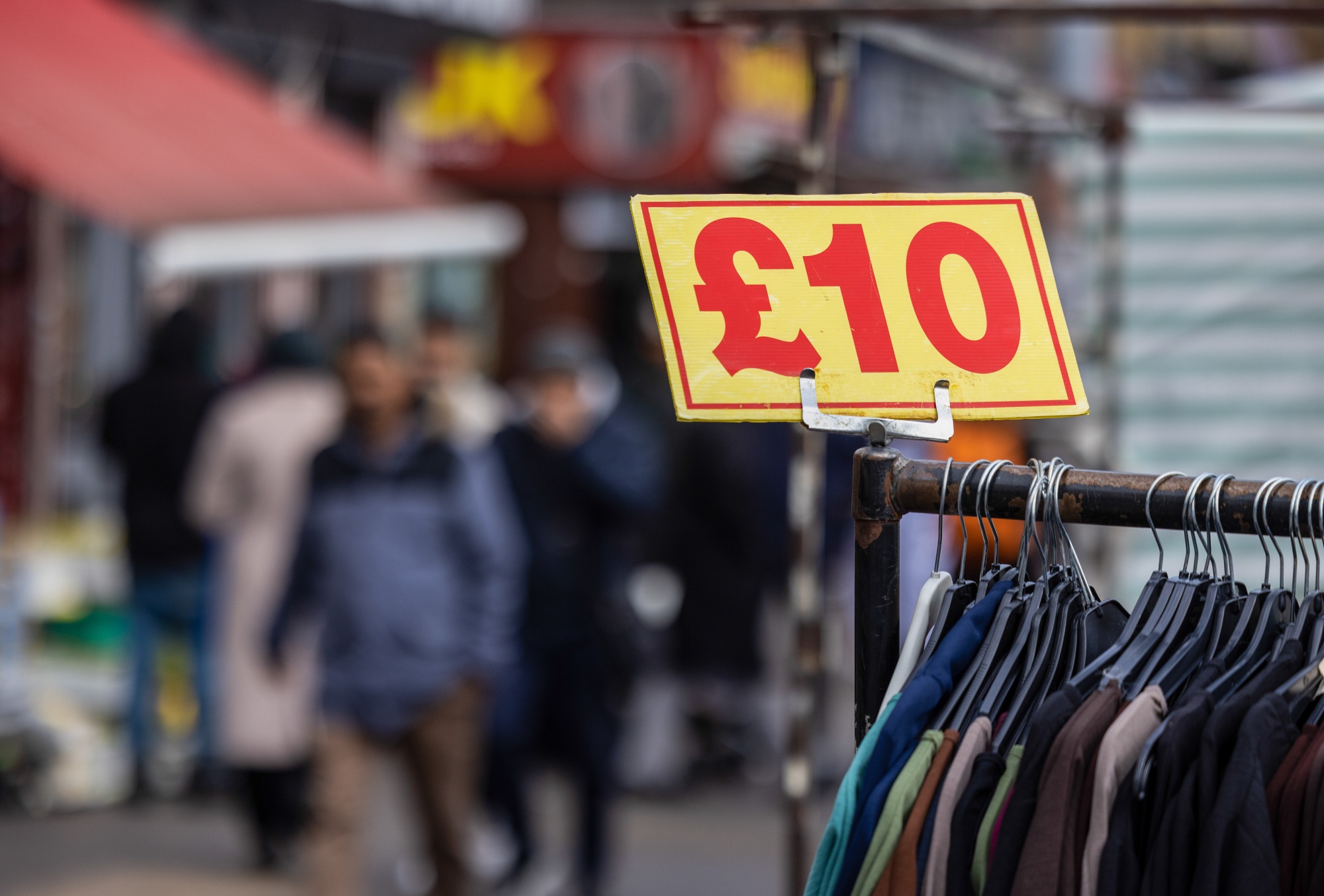 伦敦泰晤士河畔市场摊位上衣架上的价格标签。摄影师:克里斯·拉特克利夫/彭博社随着燃油价格上涨,英国通胀上个月放缓的幅度低于预期,促使交易员取消对降息的押注。