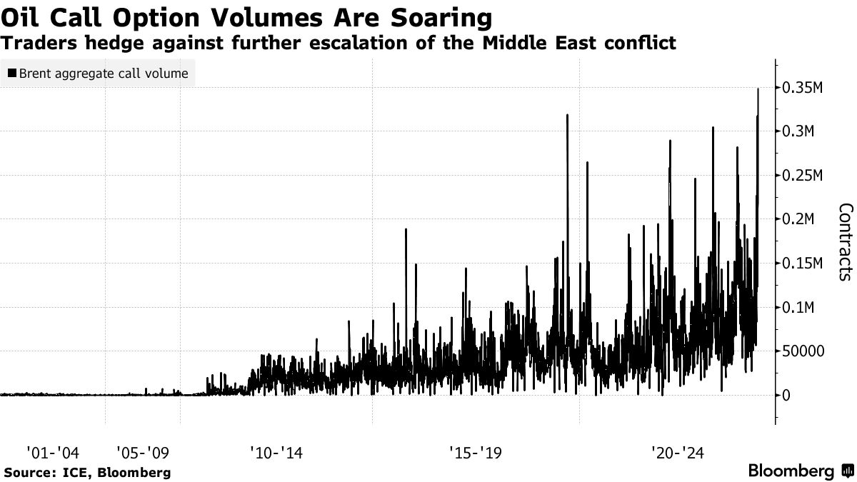 与此同时,布伦特原油价格回升至每桶90美元左右,看涨的布伦特期权交易量刚刚超过2019年创下的纪录。交易员们在以色列誓言回应伊朗周末导弹和无人机袭击后押注油价进一步上涨。