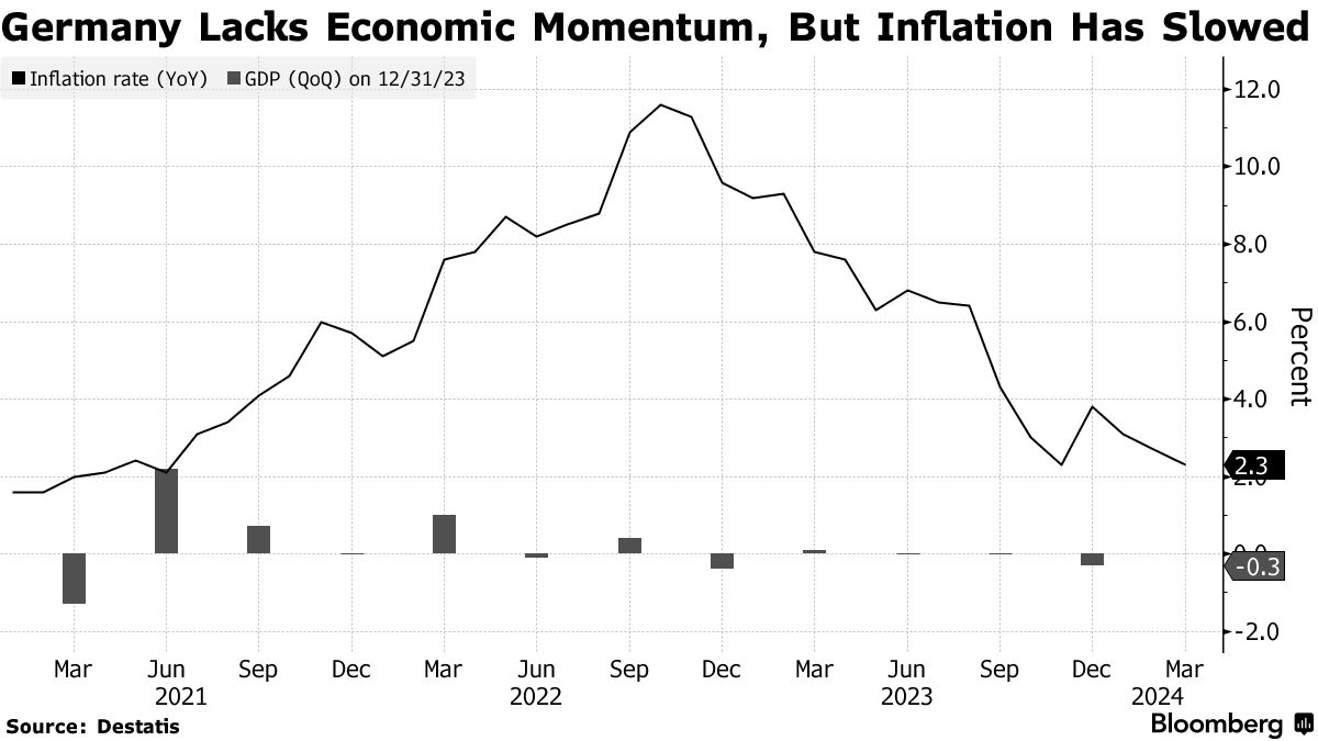 德国通货膨胀从2022年底的超过11%的峰值下降到了3月份的仅2.3%。然而,经济产出已经糟糕了一年多,国际货币基金组织预计2024年的增长仅为0.2%,比其七国集团中的任何一个都要糟糕。该基金预测,美国经济今年将增长2.7%。