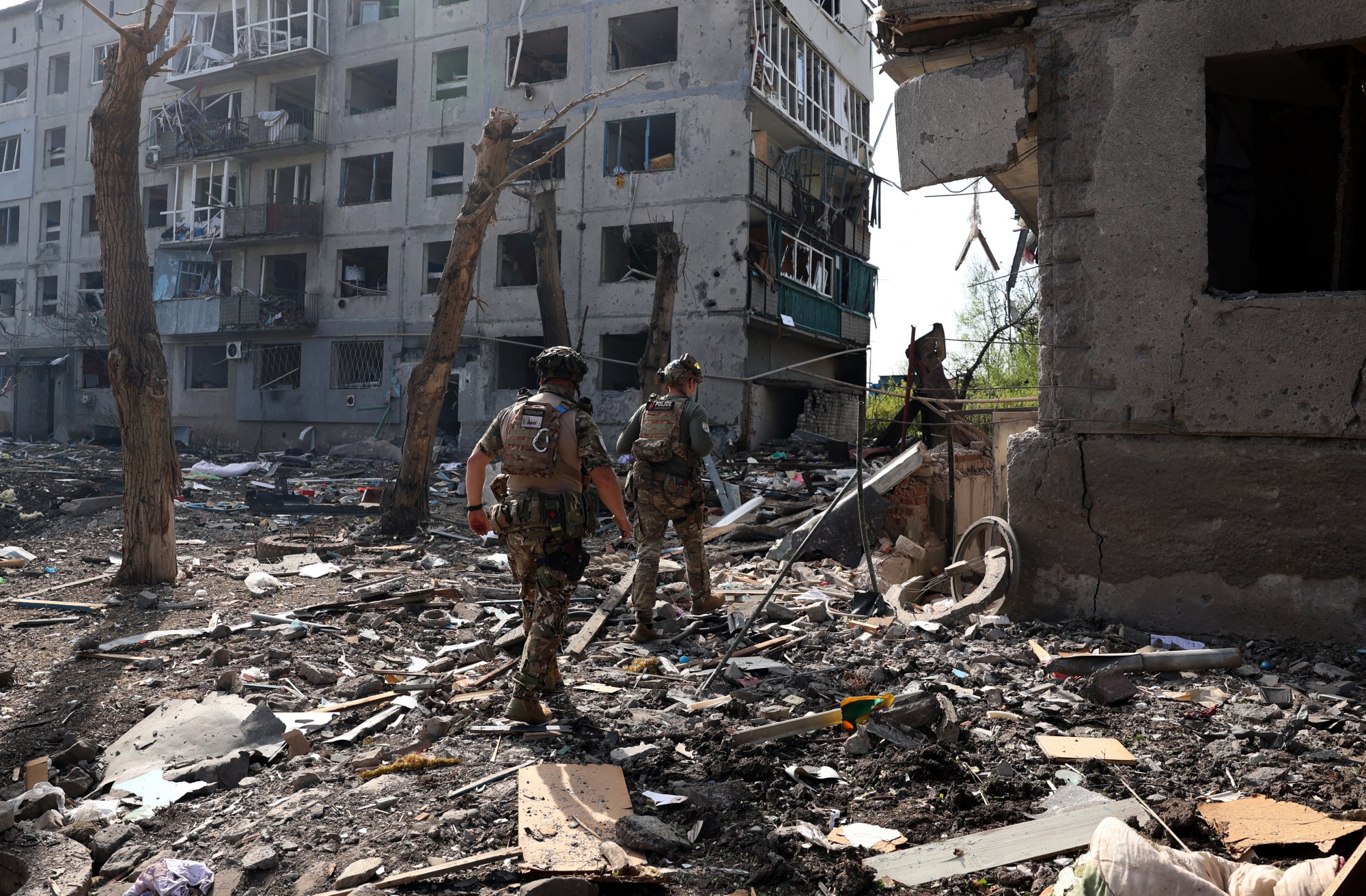 特警部队“白天使”亨纳迪·尤丁47岁(左)和德米特罗·索洛维伊23岁(右)在乌克兰顿涅茨克地区阿夫迪夫卡镇附近的奥切雷特内村疏散当地居民时,经过被摧毁的建筑和碎片,2024年4月15日,俄罗斯入侵乌克兰期间。(Anatolii STEPANOV / AFP摄)(Anatolii STEPANOV / AFP通过盖蒂图片社摄)摄影师:Anatolii STEPANOV/AFP美国众议院议长迈克·约翰逊正推进对乌克兰和以色列的新援助计划,面对共和党强硬派威胁要罢免他,通知议员们详细计划。