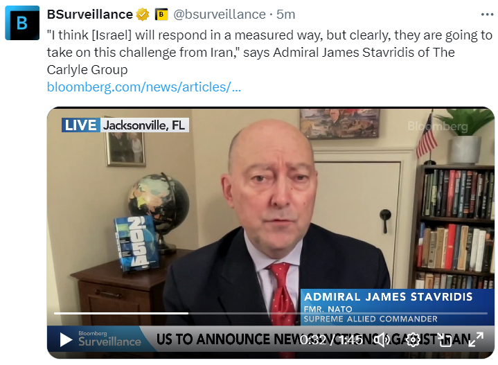 以色列尚未对伊朗史无前例的,尽管不成功的轰炸做出回应。但詹姆斯·斯塔夫里迪斯(James Stavridis)说,它的手指仍然在扳机上,他是彭博观点专栏作家,也是退役的美国海军上将,曾担任北约最高指挥官。