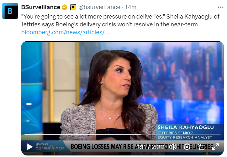 但波音的后果显而易见:Kahyaoglu表示,由于装配线放缓,其2024年的100亿美元自由现金流目标面临风险,她将对737 Max的产量预测从500架减少到400架。交付减少将使美国航空公司的产能减少约2.5个百分点。