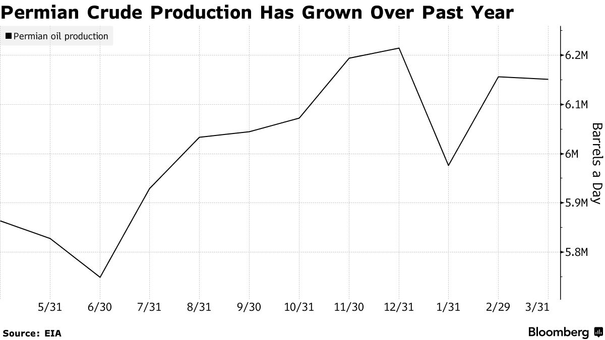 Permian产量前景受到井效问题和钻井商计划减少增长并向股东返还更多现金的影响。根据美国政府的估计,该地区预计在5月份每天产出约617万桶原油。这比去年12月的622万桶的峰值有所下降,但仍然是六年前产量的两倍多。