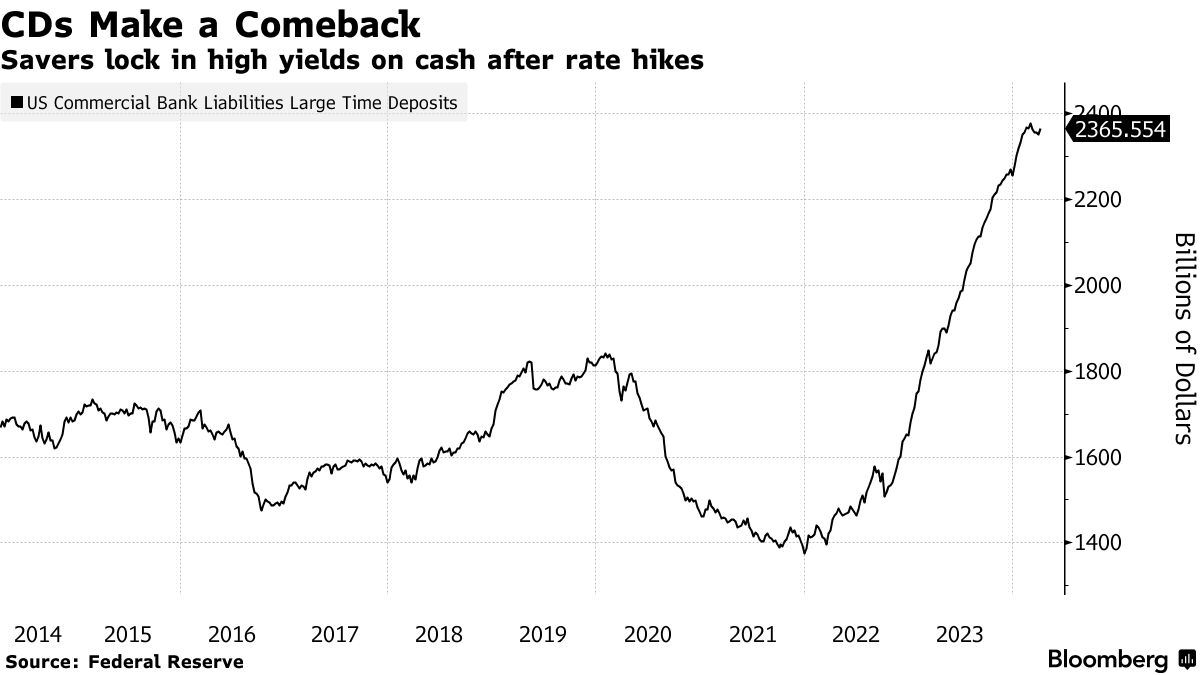 也许最明显的地方莫过于定期存单,这种存单会将现金锁定一段时间 —— 通常因此提供更高的利率。美国商业银行在2023年底持有了2.26万亿美元的大额存单(定义为10万美元或更多),美联储的数据显示。这比前一年增加了6150亿美元,是有记录以来最大的年度增长。