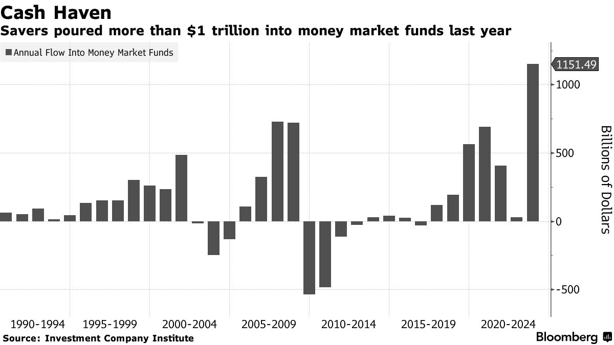 一些货币市场基金,没有像定期存款证书那样的锁定规定,提供约5%的收益率。根据投资公司协会的数据,这些工具中的现金金额在2023年增加了超过1万亿美元,是有史以来最大的增长。