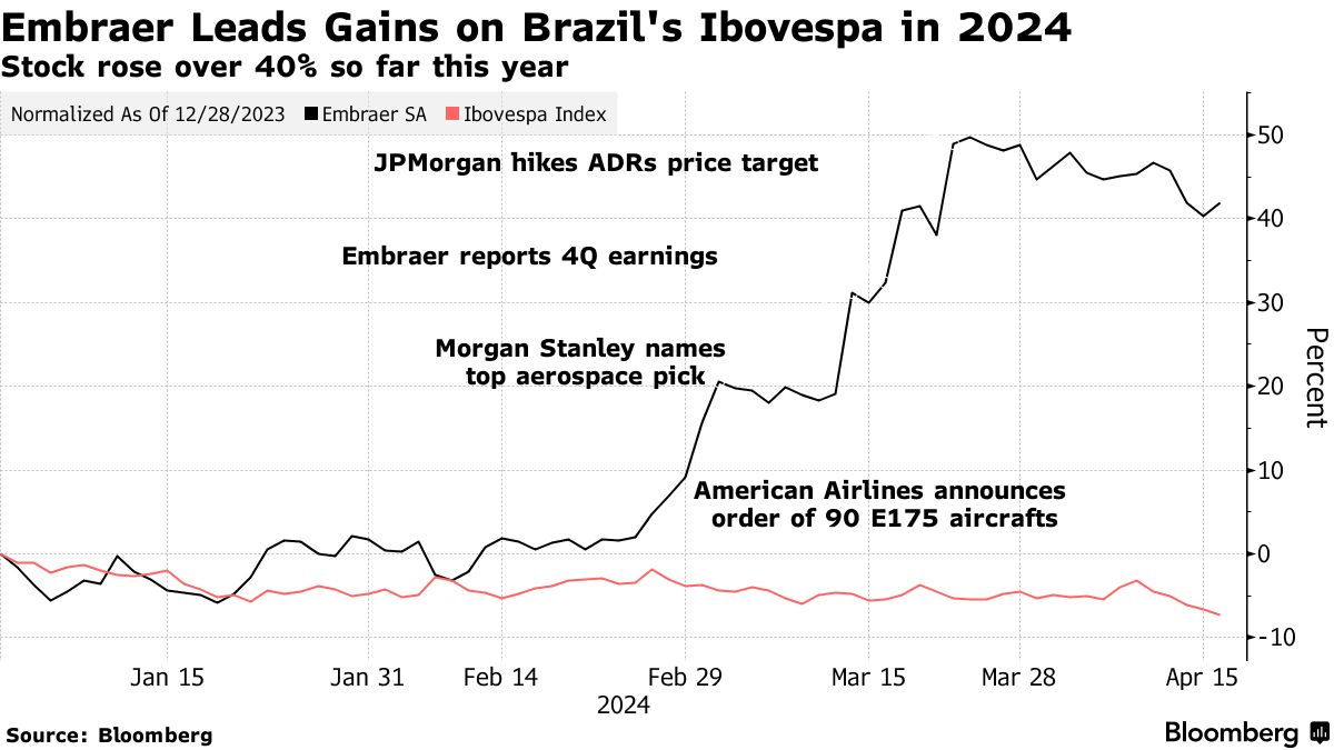尽管Embraer报告称第四季度交付量低于预期,但其2024年的指引——合并营收在60亿美元至64亿美元之间,预计其商用航空和行政航空部门的交付量强劲——推动股价飙升。摩根大通提高了其ADR的价格目标,称其增长前景“优越”。