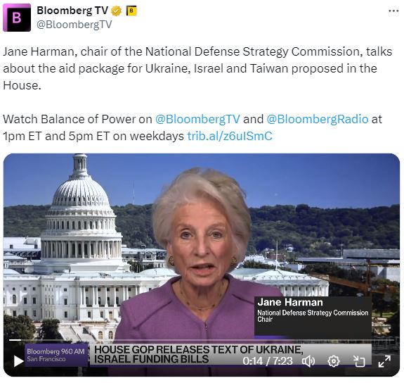 今天在彭博电视台的权力平衡早间版节目中,主持人乔·马修和凯利·莱因兹采访了国防战略委员会主席简·哈曼,谈到了众议院提出的针对乌克兰、以色列和台湾的援助计划。