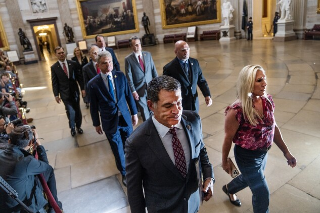 众议院共和党弹劾经理马克·格林(田纳西州)、玛乔里·泰勒·格林(乔治亚州)、迈克尔·麦考尔(德克萨斯州)、克莱·希金斯(路易斯安那州)、本·克莱恩(弗吉尼亚州)、安迪·比格斯(亚利桑那州)、迈克尔·盖斯特(密西西比州)、劳雷尔·李(佛罗里达州)和奥古斯特·普卢格(德克萨斯州)于2024年4月16日穿过国会圆形大厅前往参议院,递交了针对国土安全部部长亚历杭德罗·迈约卡斯的弹劾条款。汤姆·威廉姆斯/CQ-Roll Call, Inc via Getty Images共和党人抨击了这一举动,并已经开始利用它来打击脆弱的民主党人,指责他们未能认真考虑对迈约卡斯的指控,尽管在乔·拜登总统任期的大部分时间里,边境发生了创纪录的移民接触。