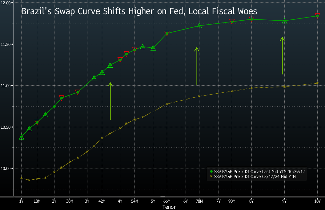 巴西雷亚尔和巴西掉期曲线受到了额外打击,因为人们担心卢拉政府没有致力于改善财政状况。国会已经批准了允许超出国家财政框架设定的限制的措施。本周,政府通过放宽2025年财政目标进一步恶化了情绪。专注于增加收入而不是削减支出也让交易员感到失望。