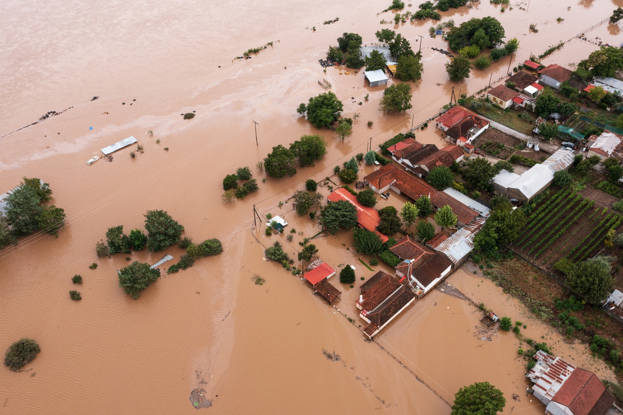 希腊特里卡拉地区2023年9月7日,风暴丹尼尔过后,被淹没的皮尼亚达村庄中的建筑物。