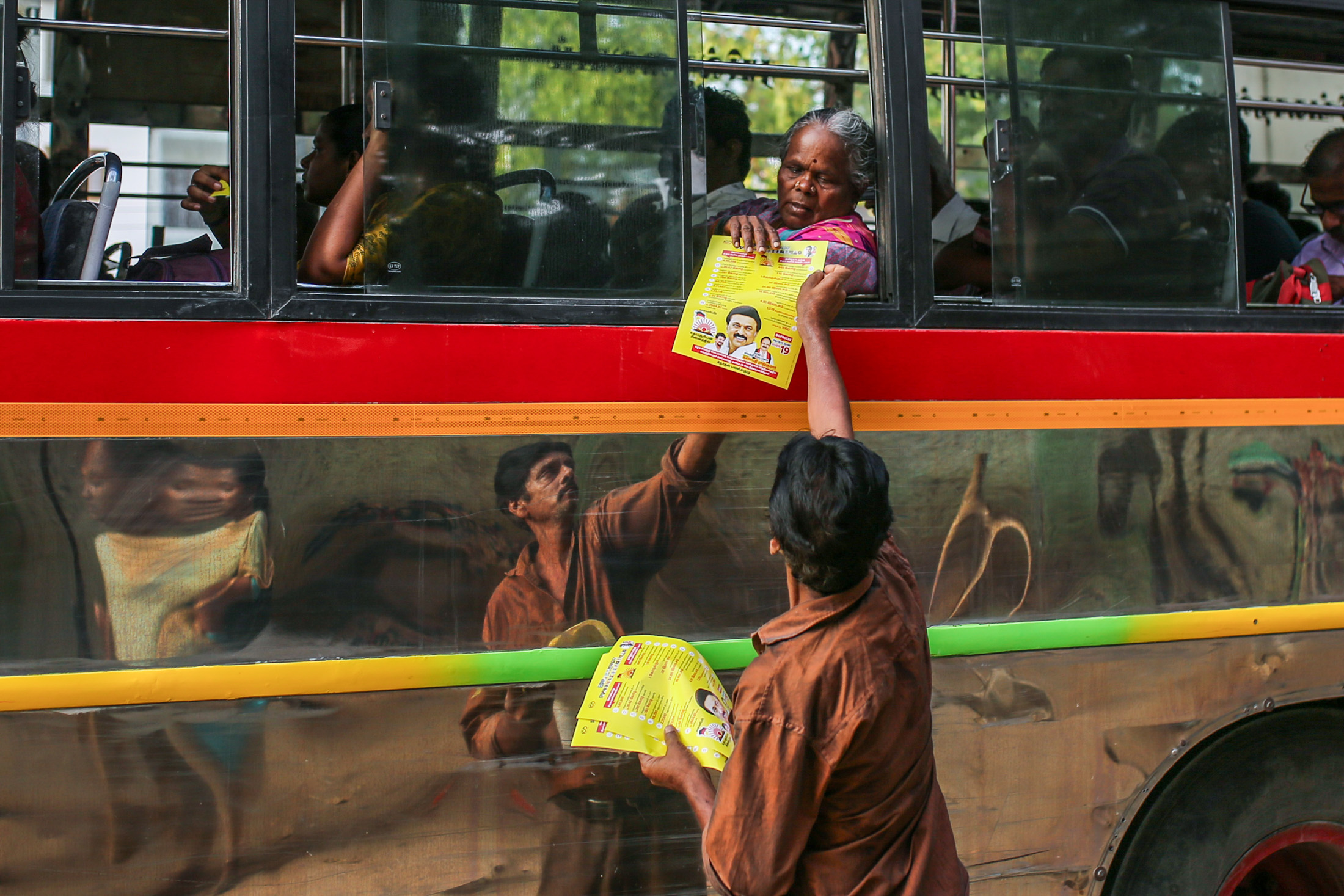 德拉维达·蒙内特拉·卡齐甘(DMK)支持者在科伊马托尔分发党的传单,4月11日。摄影师:Dhiraj Singh/Bloomberg“在大多数南部邦,人们对人民党的情绪是压倒性的,”马德拉斯大学政治学教授拉穆·马尼瓦南说。