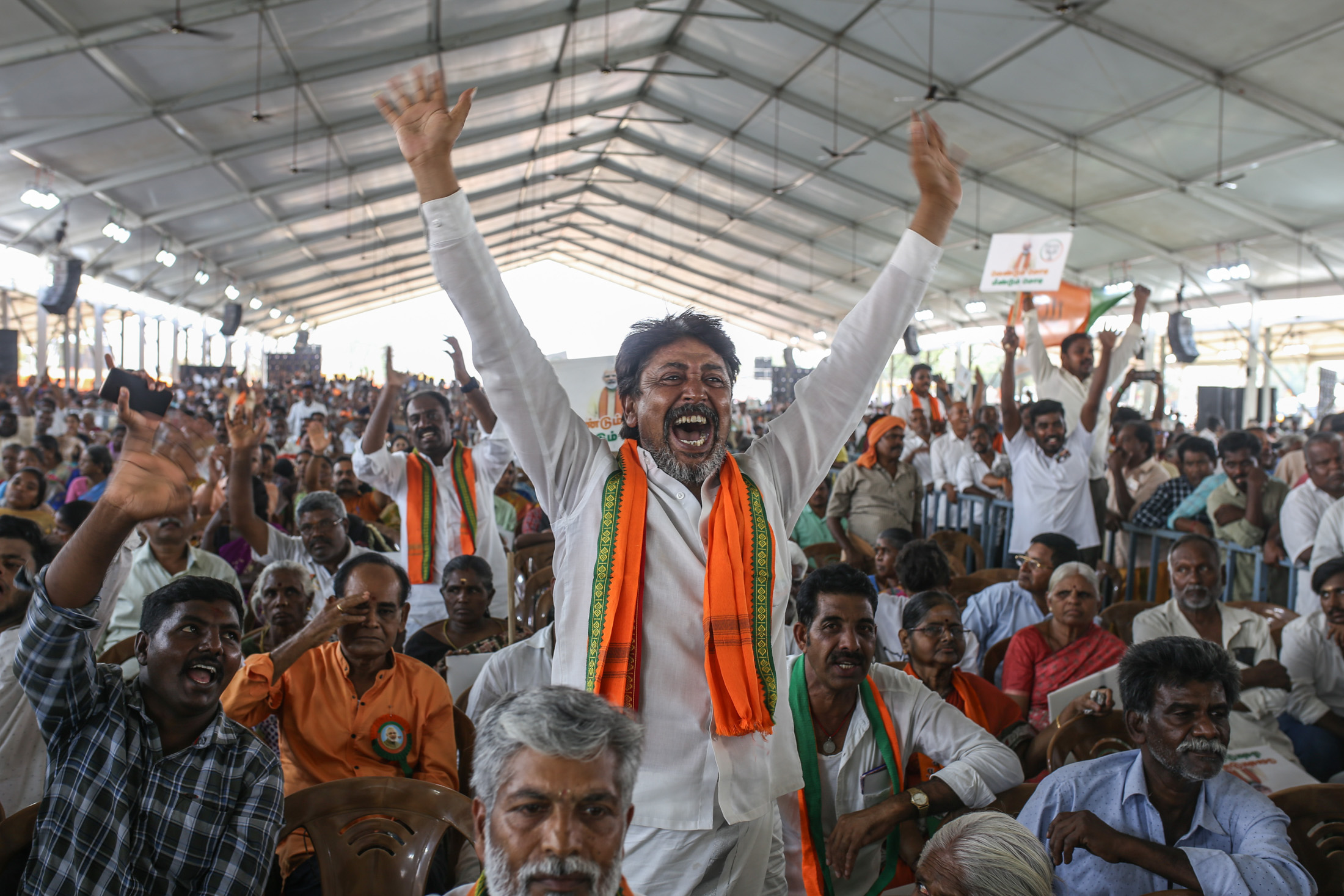 4月12日在科伊梅托尔举行的一场反对派竞选集会上的与会者。摄影师:Dhiraj Singh/Bloomberg在纳拉苏皮兰村,选民们担心高通货膨胀和发展不足 —— 这与莫迪在访问泰米尔纳德邦期间强调的许多问题颇为相似。