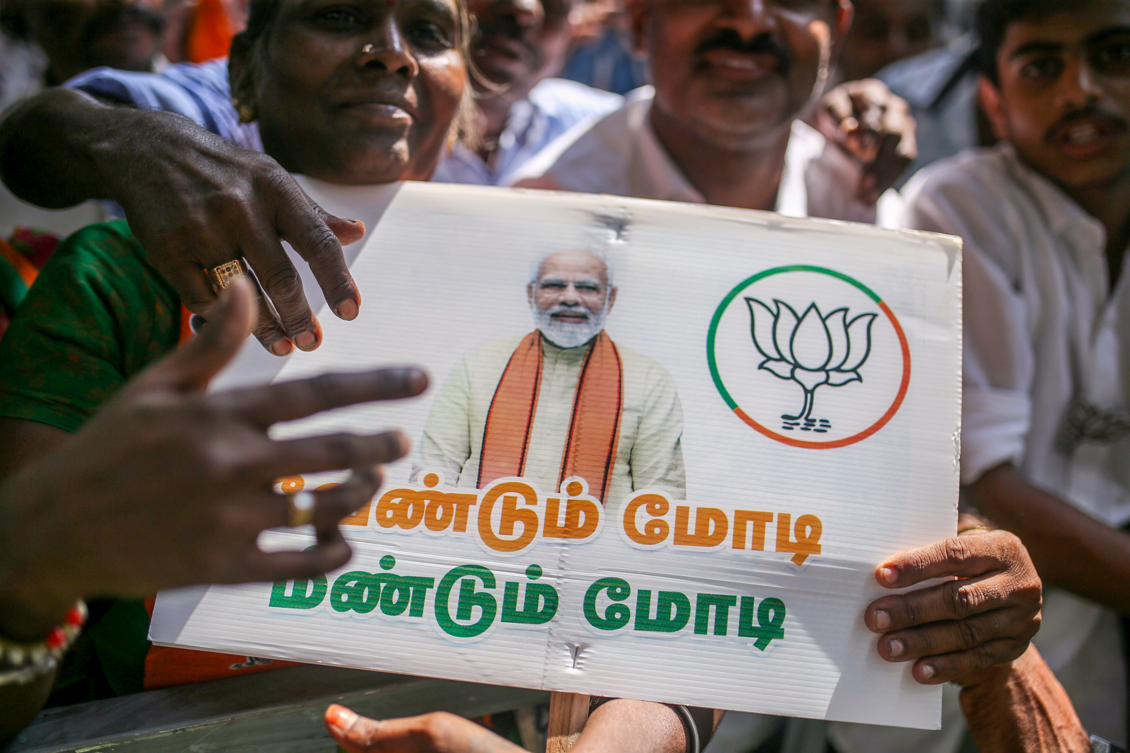 支持者们在4月10日与印度总理纳伦德拉·莫迪在泰米尔纳德邦的哥印拜陀举行的竞选集会上举着一块泰米尔语标语。