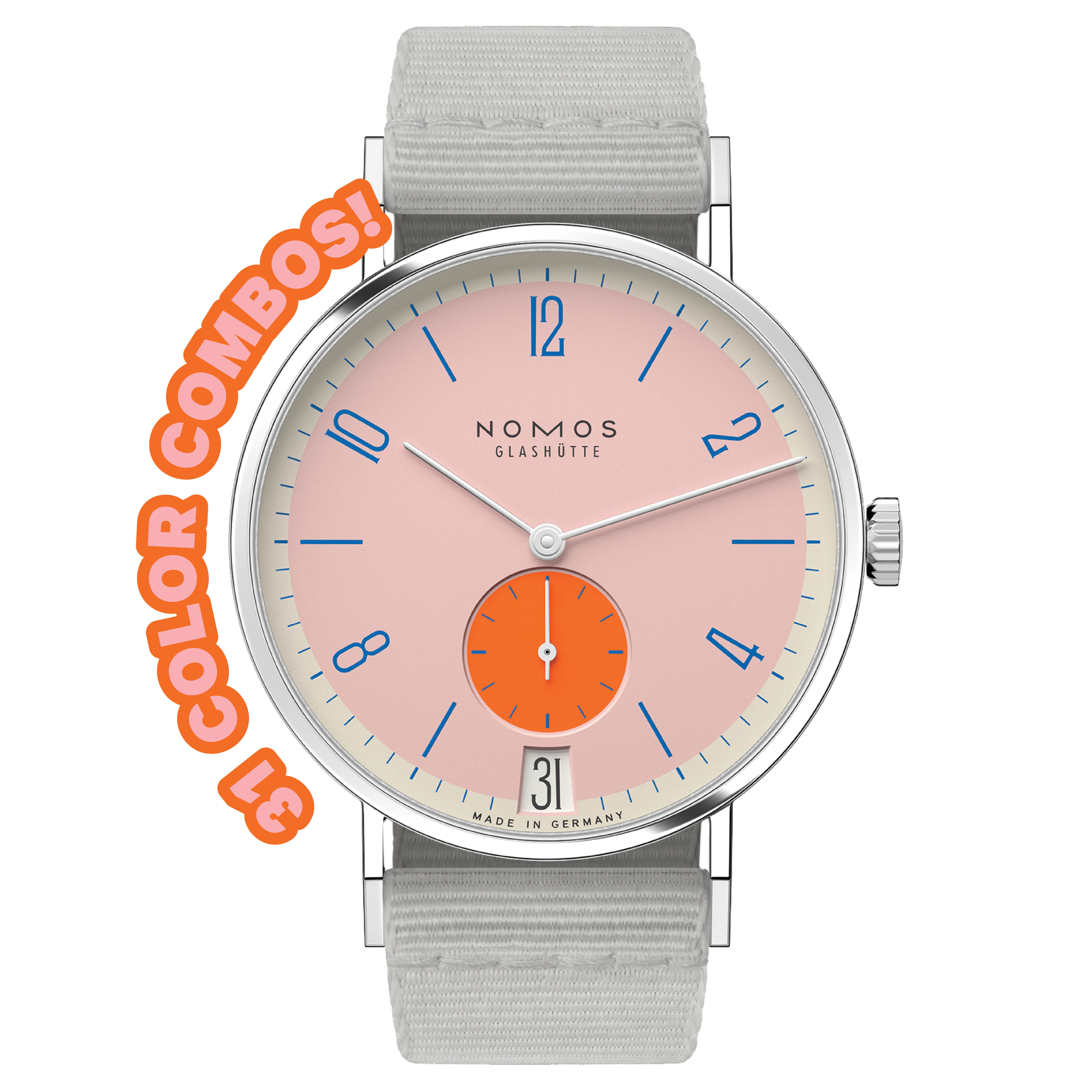 Nomos Glashütte Tangente 38 date watch in Flamingopink来源:Nomos Glashütte这个德国品牌拿出了他们的Tangente型号,并推出了31种颜色组合。像超级沙丁鱼、柠檬饼干和宫廷淑女这样的名字,既欢快又富有创意,吸引眼球,同时又非常简单——符合设计导向和平易近人的制表商的理念。每种颜色款式只销售175只。€1,925($2,050)
