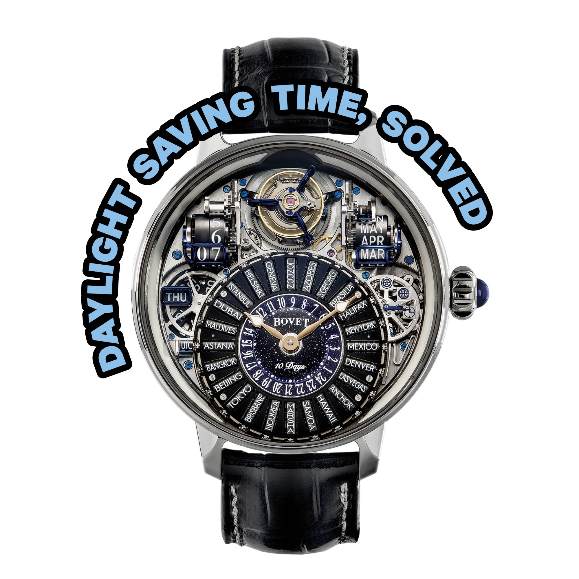 宝维 Recital 28 Prowess 1 手表来源:宝维这款世界时间手表于二月份推出,通过一种创新的滚轮系统解决了夏令时的问题,可以调整所有 24 个时区的季节性变化。它还具有美国夏令时、欧洲冬令时等设置。这款直径 46.3mm、厚度 17.85mm 的手表配备了飞行陀飞轮、永久历和 10 天动力储备。702,650瑞士法郎(77万美元)