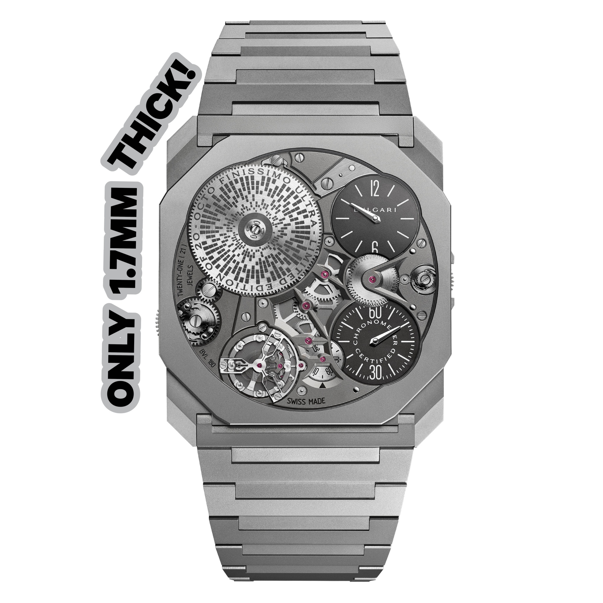 Octo Finissimo Ultra COSC腕表来源:宝格丽每年,宝格丽几乎都会刷新最薄机械手表的纪录。今年,它以 Octo Finissimo Ultra 重新夺回了这个头衔,仅 1.7 毫米厚。虽然看起来非常脆弱——各种媒体称它像“一根意大利面条”那么薄,“如此薄以至于看起来不真实”——但这款手表是由超强钛制成的。只生产 20 只。529,000美元