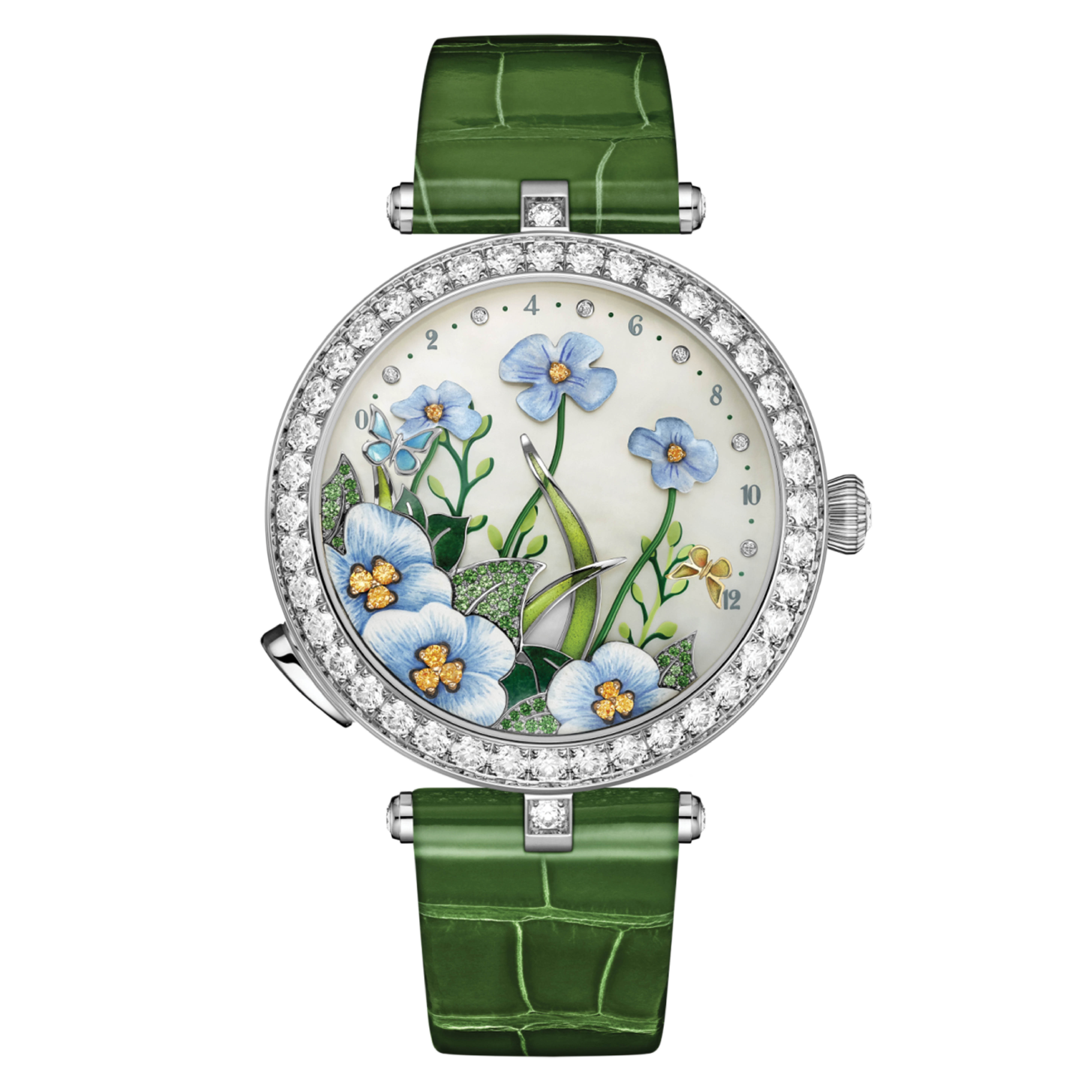 梵克雅宝夏日微风女士腕表来源:梵克雅宝按下按钮,花朵开始独立摇摆,仿佛在轻柔的夏日微风中。白色和黄金蝴蝶围绕表盘飞舞,最终停下时用它们的翅膀告诉时间。罕见的珐琅工艺,如凹凸珐琅、凹凸珐琅和曲面透光珐琅,使这款手表成为一件精致的喜悦。177,000美元