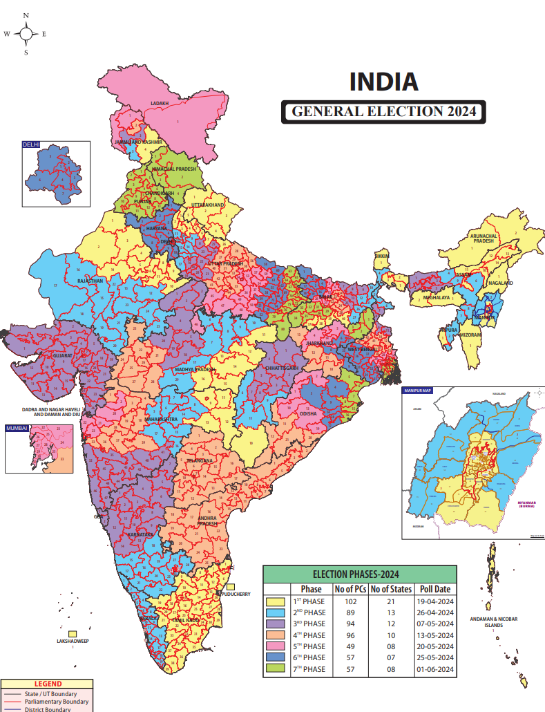 印度庞大的选举将持续到6月1日,计票定于6月4日进行。这张来自印度选举委员会的地图显示了哪些选区何时投票。
