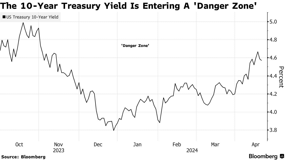 过去一周,数据显示通货膨胀持续高企,导致市场情绪进一步恶化。周二,10年期国债收益率飙升至近4.7%,随后在周四回落至4.57%。交易员们押注美联储将在9月开始降息,比一个月前预期的6月要晚得多。