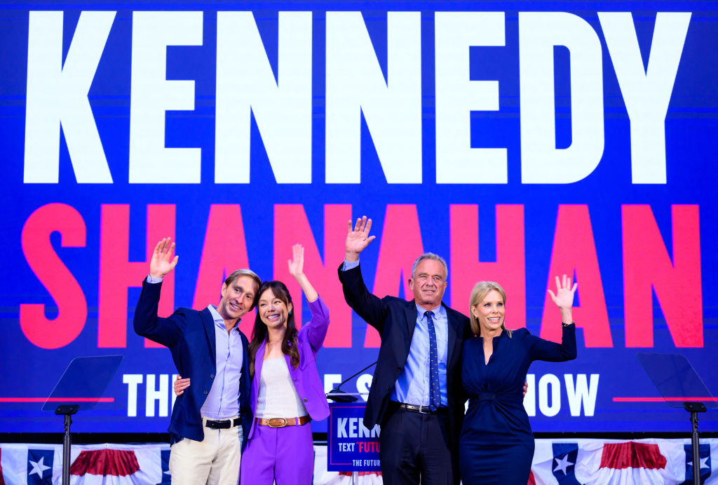 罗伯特·F·肯尼迪(Robert F Kennedy Jr.)在加利福尼亚州奥克兰宣布他的竞选搭档尼科尔·沙纳汉(Nicole Shanahan),两人的配偶也在场。