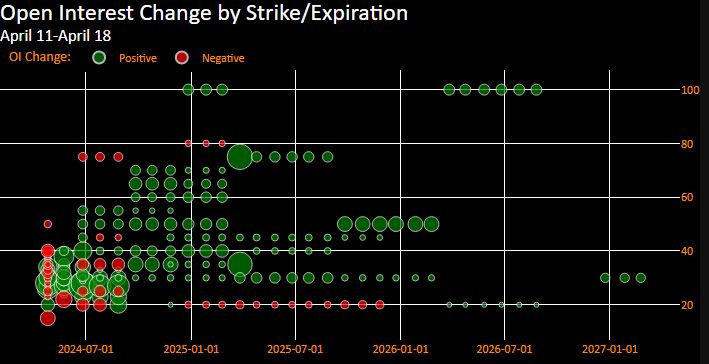 过去一周,高行权价的天然气期权头寸增加来源:彭博社在经历了一段相对平静的时期后,市场波动性正在加剧最近几个月。ICE数据显示,天然气期权交易量同比增长84%,合约持仓量同期增长117%。4月16日,荷兰天然气期货和期权的交易量创下单日纪录,达到693,970份合约。