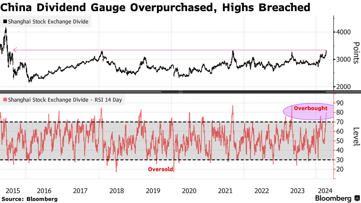 上证绩优股息指数今年已飙升近20%,达到2015年中期以来的最高水平,主要由周期股如能源公司和银行领涨。本周其14日相对强弱指数已接近80,远高于通常被视为超买的70水平。