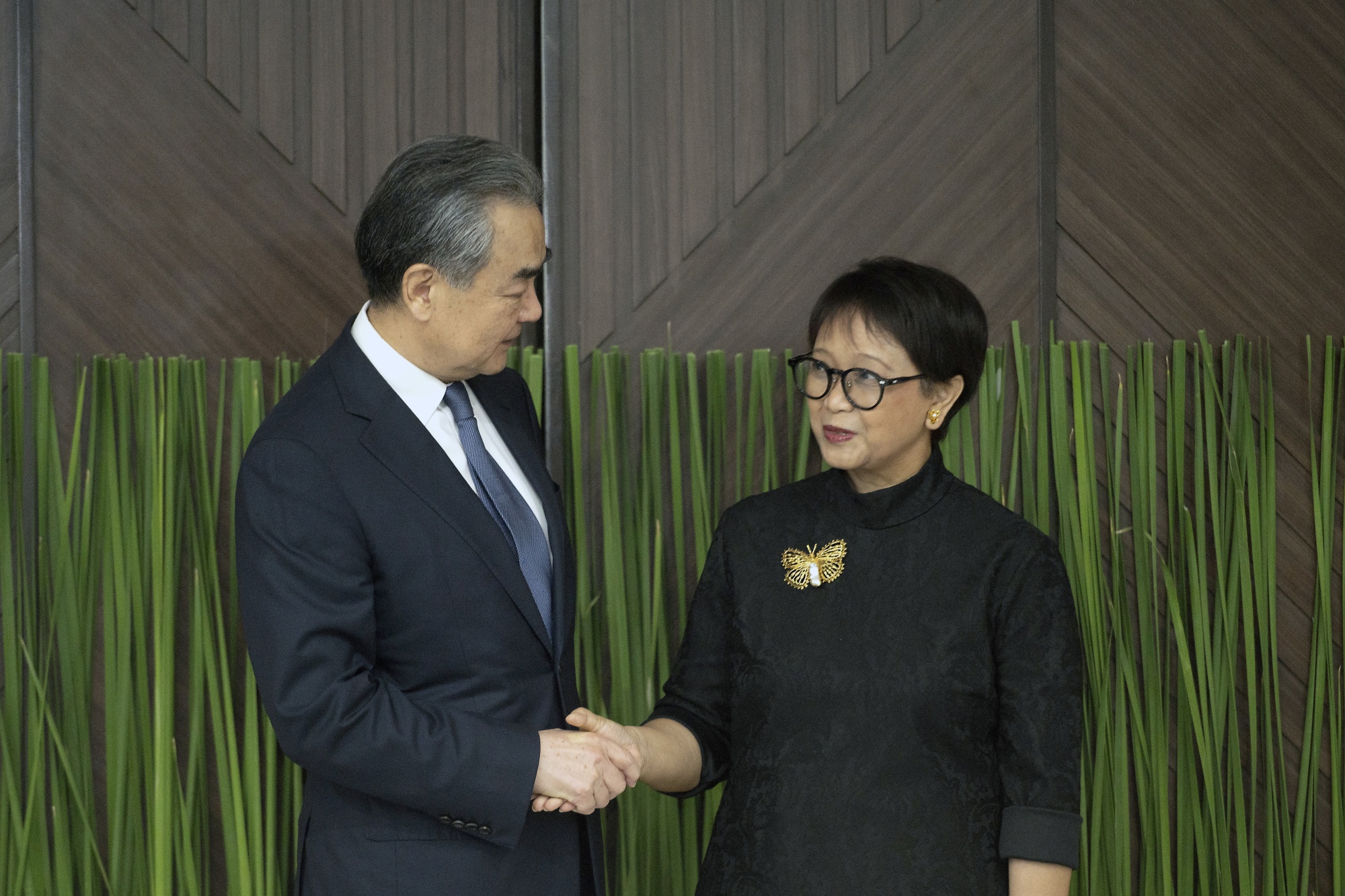 王毅,左,和Retno Marsudi在雅加达,4月18日。摄影师:Rosa Panggabean/Bloomberg