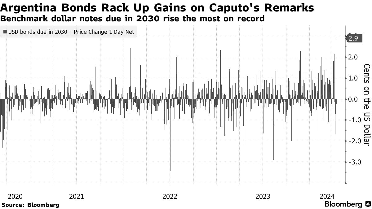 阿根廷经济部长路易斯·卡普托告诉投资者,总统哈维尔·米莱致力于进行大规模财政调整,这帮助推动了周三晚间该国债券的上涨。