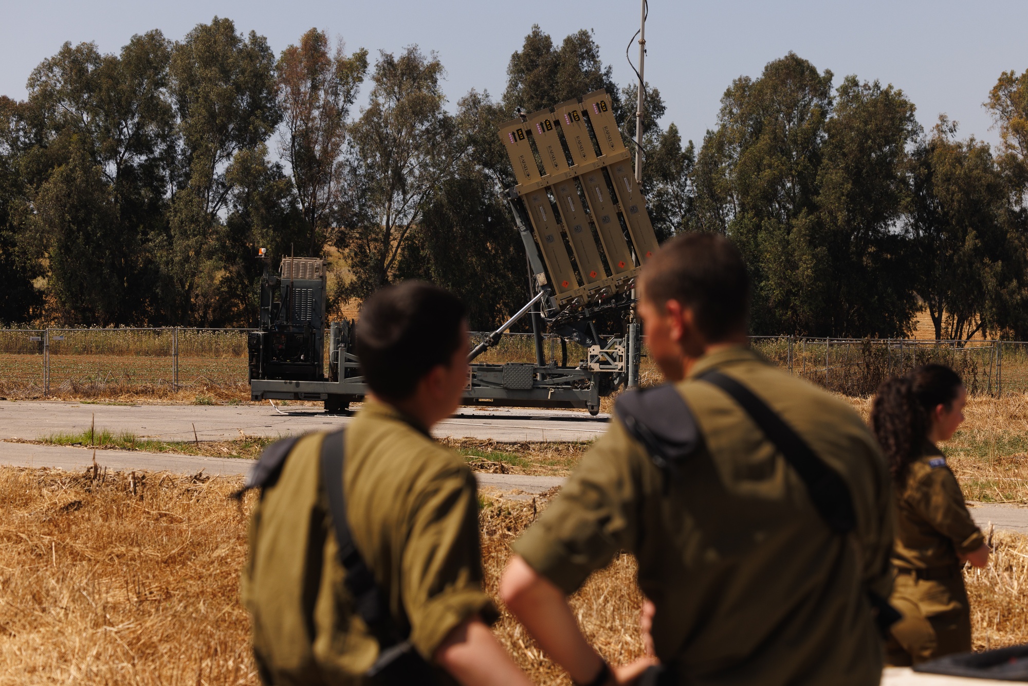 以色列士兵在4月17日位于以色列南部加沙边境附近的铁穹反导弹阵地。