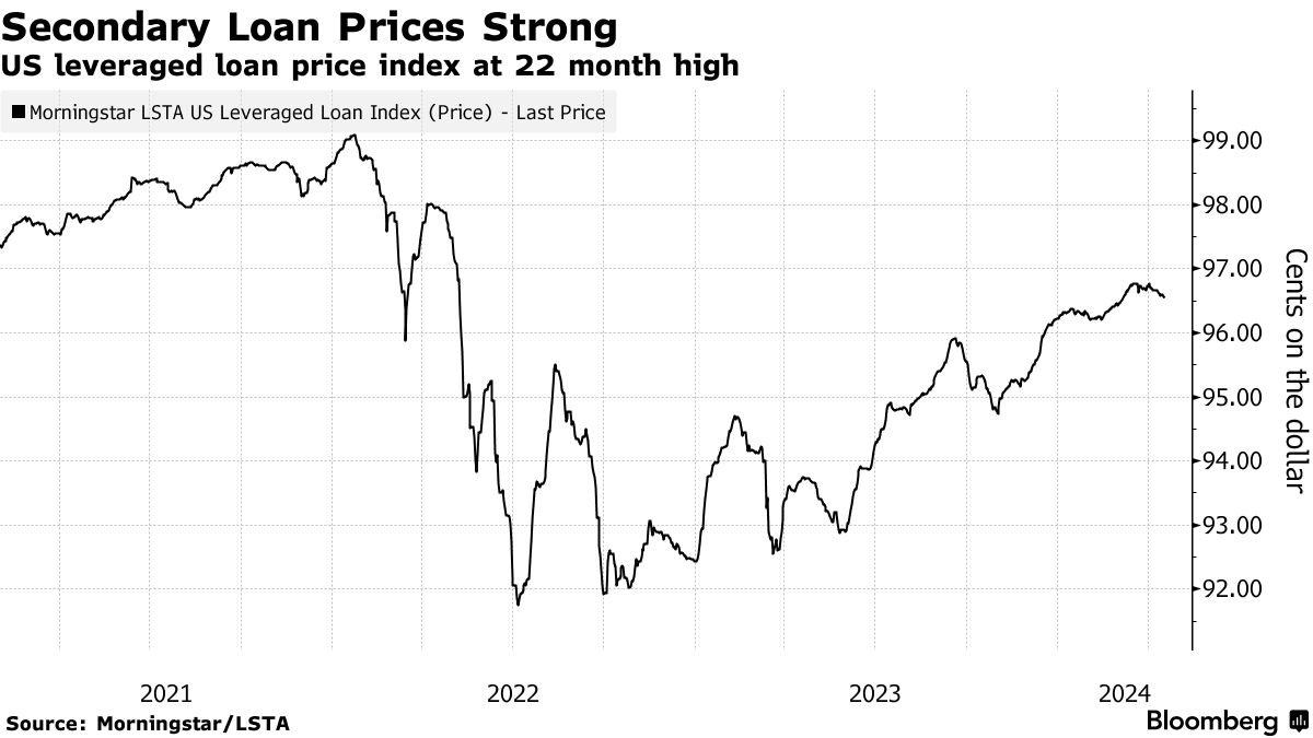 尽管略有放缓,但二级市场贷款价格仍保持在96美分以上。这些高价使借款人能够重新定价贷款,从中削减25至50个基点的利差。