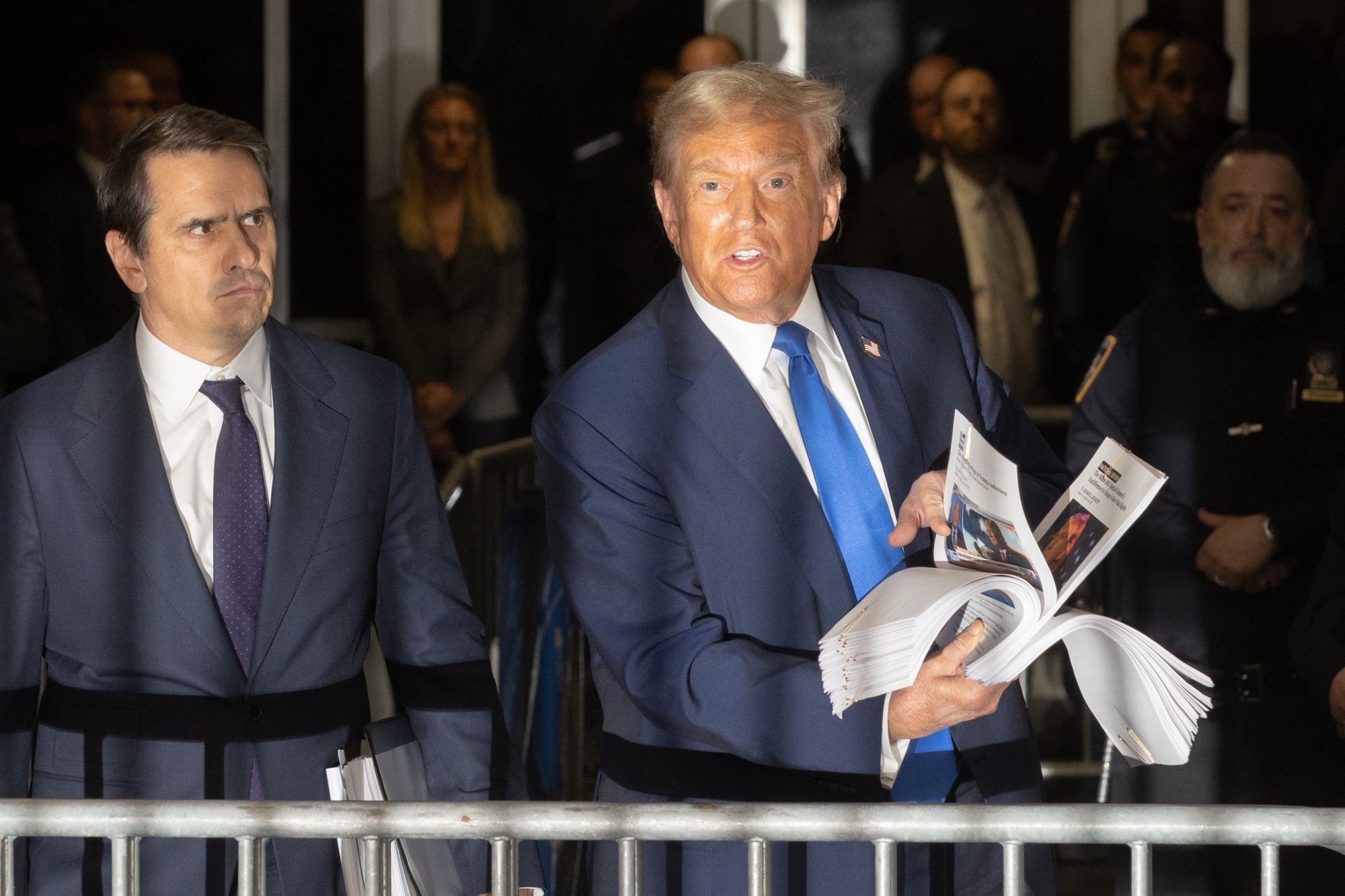 - 检察官克里斯托弗·康罗伊告诉默钦,自周末以来,特朗普违反了法官4月1日的禁令,违反次数多达七次,包括在陪审员选拔开始前的周一发布的帖子。康罗伊表示,“最令人不安”的是特朗普在4月17日发布的Truth Social帖子,声称“卧底自由派激进分子”正在“向法官撒谎以进入陪审团。” 特朗普的律师之一埃米尔·博夫辩称,特朗普是在自卫,如果特朗普转发了他人的声明,这并不构成违反。默钦同意在周二举行听证会,以确定前总统是否应因违反禁令而被罚款。“我们将在听证会上解决这个问题,”默钦周四表示。
