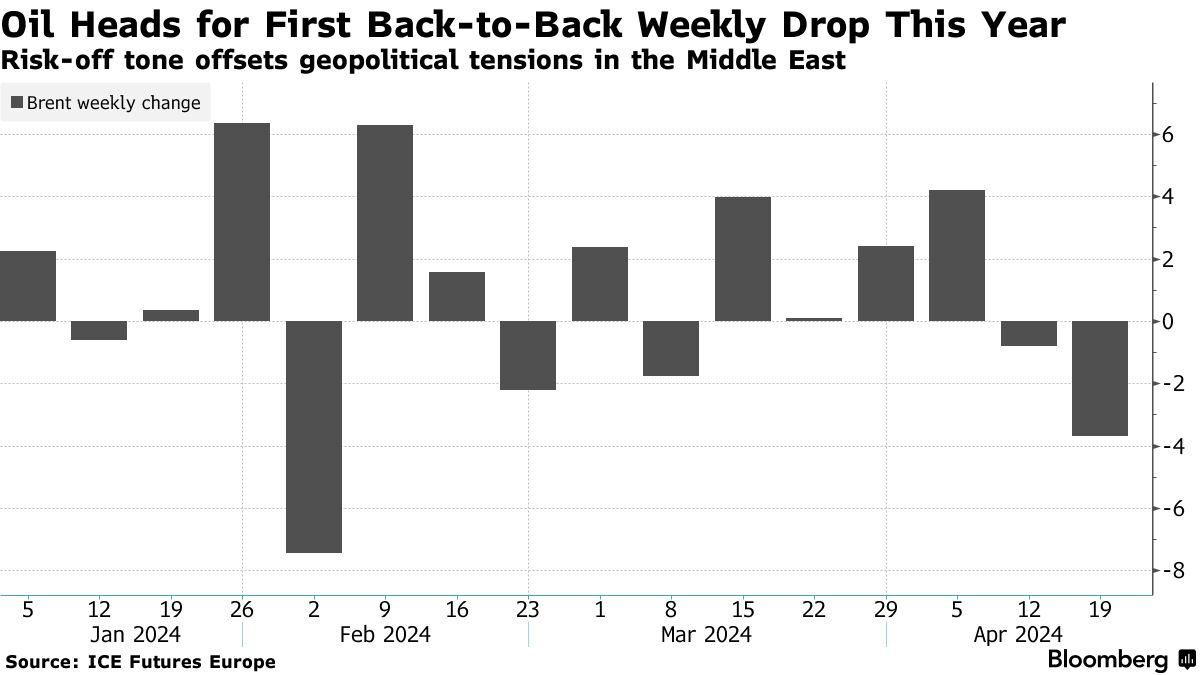 石油正面临今年首次连续两周下跌,因为美联储决策者鹰派评论引发的更广泛的避险情绪抵消了中东地区持续的紧张局势。