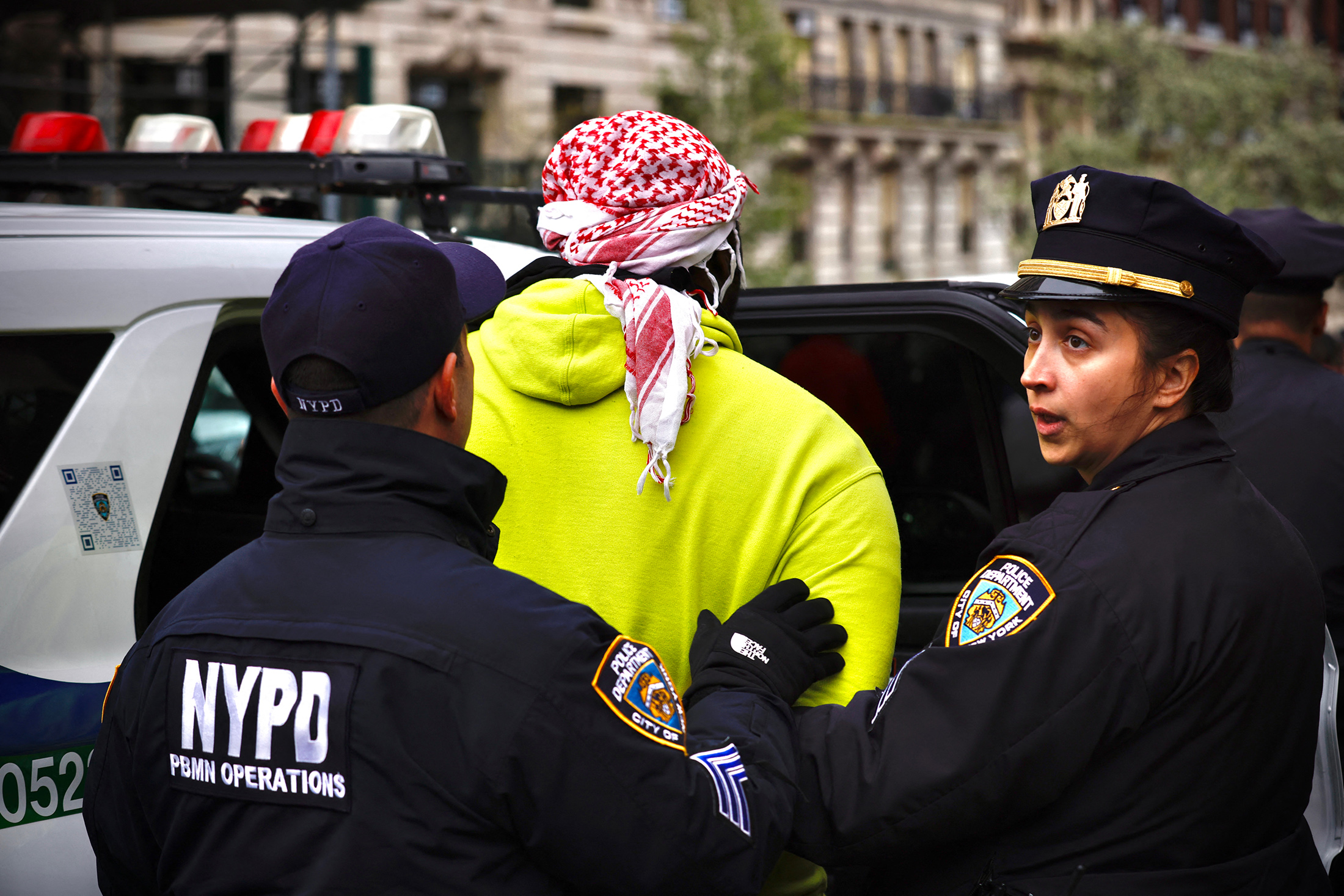 纽约警察局警官在4月18日在纽约哥伦比亚大学外拘留一人。摄影师:Kena Betancur/AFP/Getty Images哥伦比亚大学周四召集纽约警察局解散校园内的一场亲巴勒斯坦抗议活动,导致108名学生因非法入侵被捕。