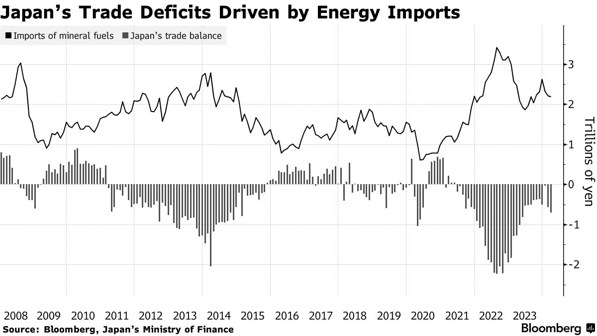 日本高昂的进口账单部分源自2011年福岛核事故后停止大部分核电站的决定。据彭博计算显示,相对于消费,该国的净能源进口在主要经济体中居首位。