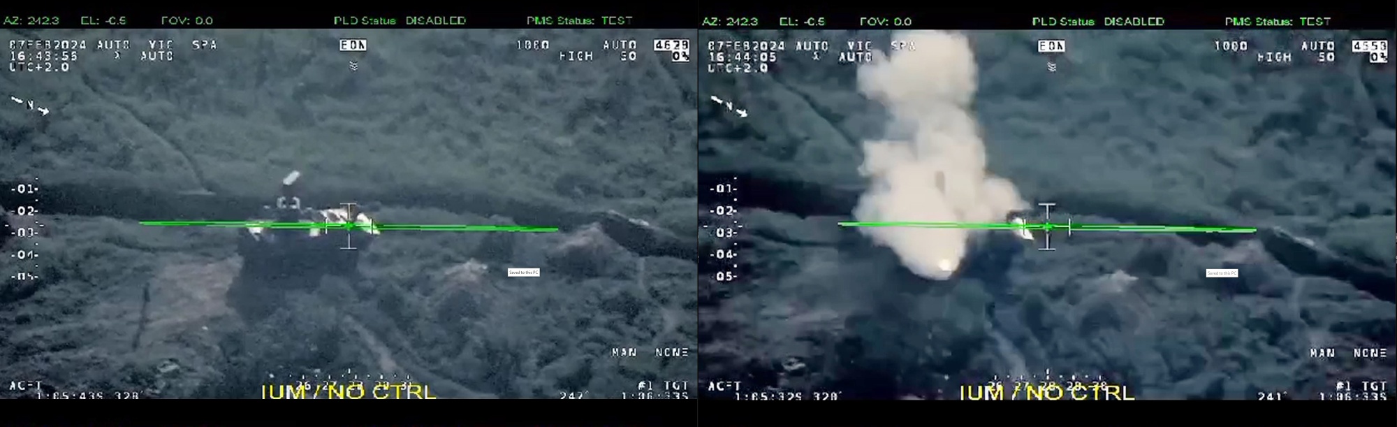 一名士兵走过装甲人员车辆,就在它发出火花和烟雾时,向联合国无人机发射一枚地对空导弹。