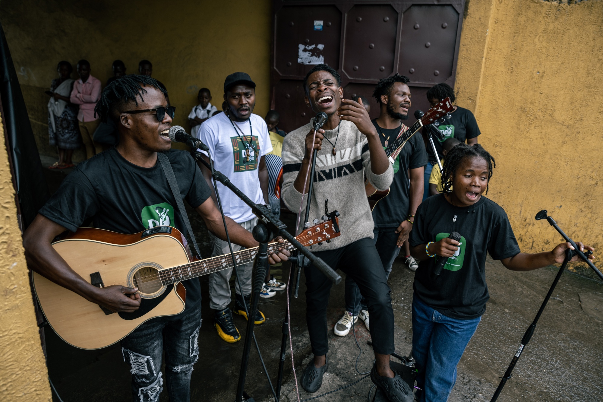 一群艺术家在戈马街头表演,以提高选举重要性的意识,4月13日。摄影师:阿莱特·巴什兹/彭博社