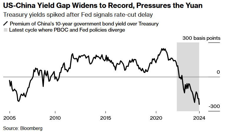 美国政府债券收益率与中国债券收益率之间的溢价已经创下历史新高,因为中国正面临通缩问题,而美国物价正在上涨。