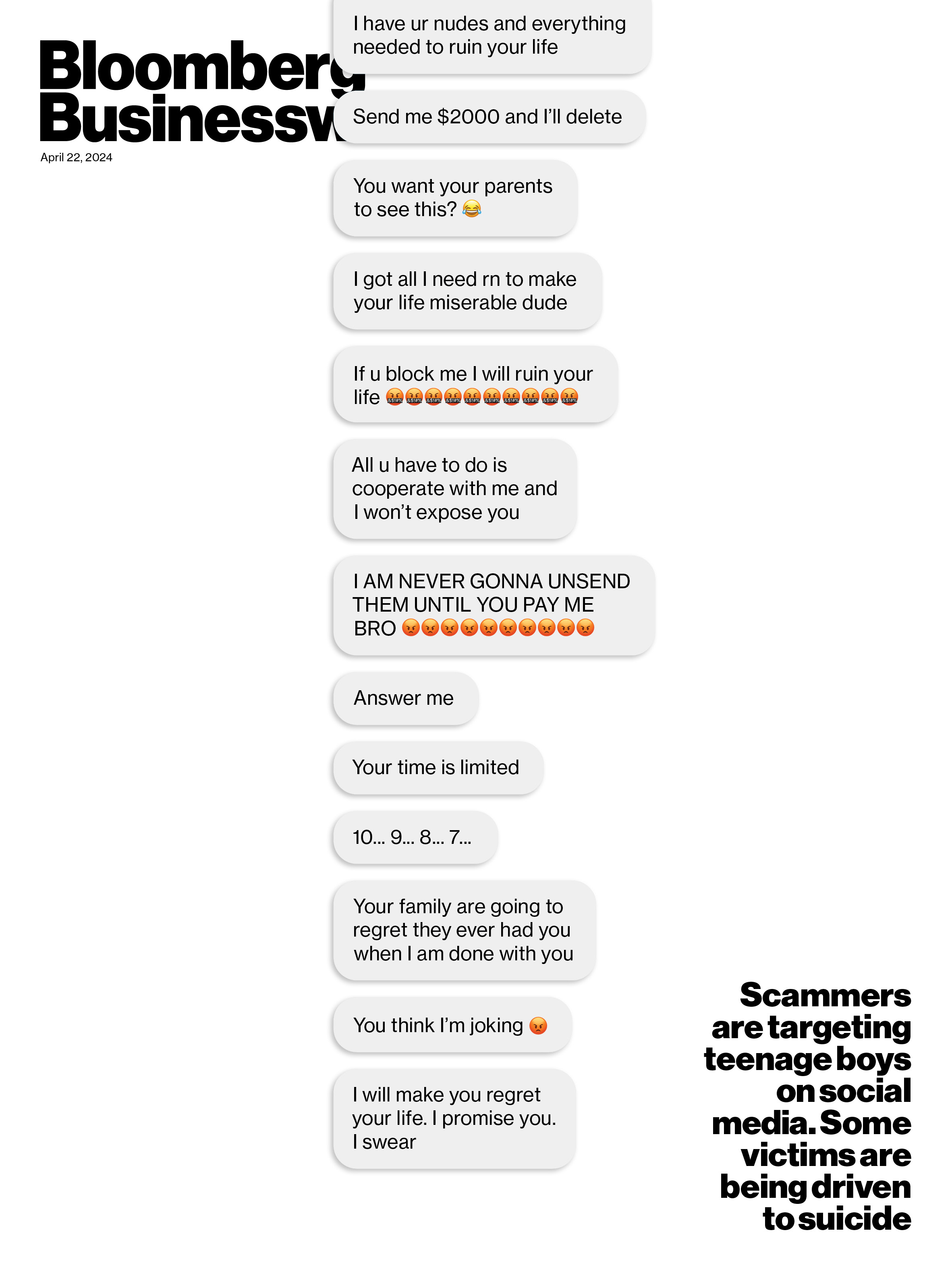 **《商业周刊》**探讨了骗子如何瞄准青少年男孩在社交媒体上,导致一些人自杀。阅读关于盗版手镯和紧身衣的“暗影Swiftie经济”。以及当你在苹果商店交换手机时到底发生了什么。