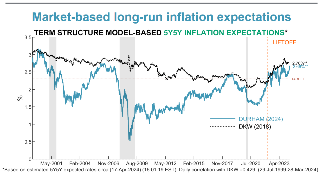 这是Piper Sandler全球资产配置负责人、前美联储经济学家本森·德勒姆说的。他指出,他调整后的长期通胀预期指标在最近几个月有所上升,超过了美联储的2%目标——这表明交易员们认为价格压力将持续到未来。