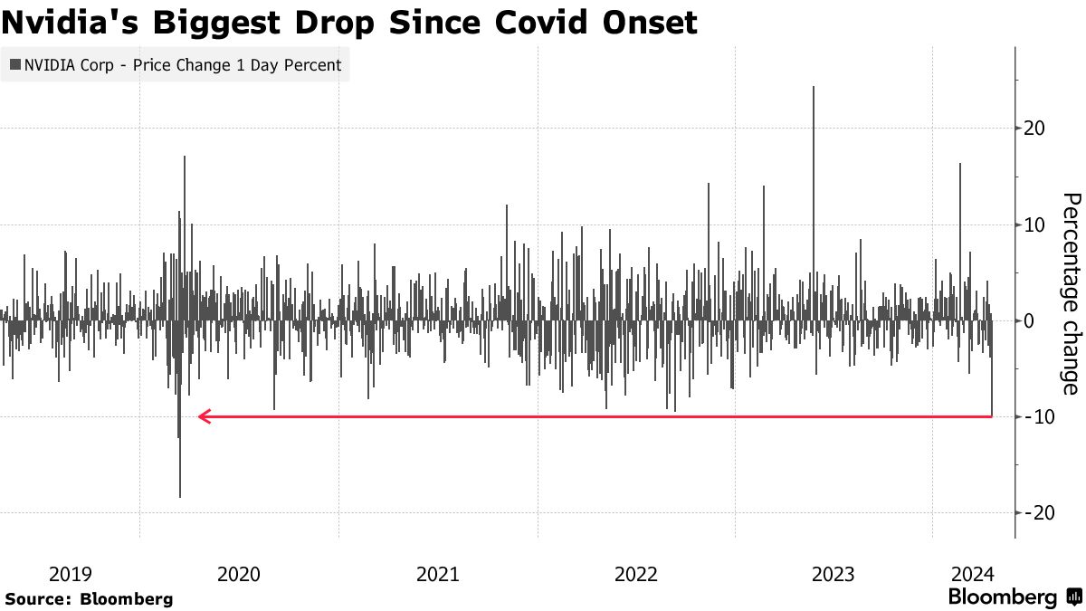 这家处理人工智能工作的设备制造商股价下跌了23%,创下自去年8月以来的最大跌幅,并收于两个多月来的最低点。芯片制造商英伟达的股价下跌了10%,创下自2020年3月疫情爆发以来的最陡跌幅,并首次跌破了其50日移动平均线。这一跌幅抹去了近2120亿美元的市值。