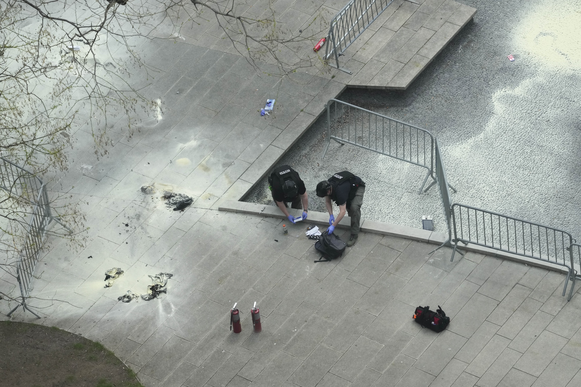 纽约警察在曼哈顿刑事法院外检查一个男子点燃自己的背包的现场,日期为4月19日。