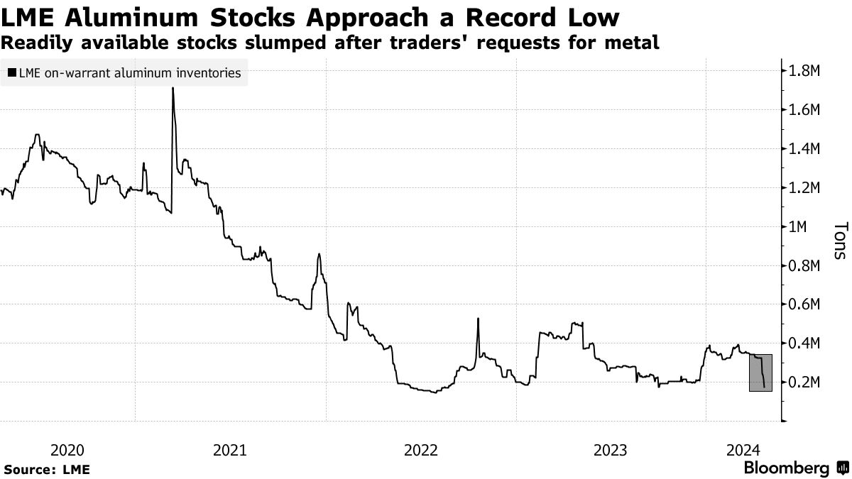 根据伦敦金属交易所的数据,本周有近4亿美元的铝被要求从韩国和马来西亚的仓库中撤出,这导致仓库系统中的现货库存接近创纪录的低位。据知情人士透露,Trafigura和Glencore本周都参与了铝的撤出订单。