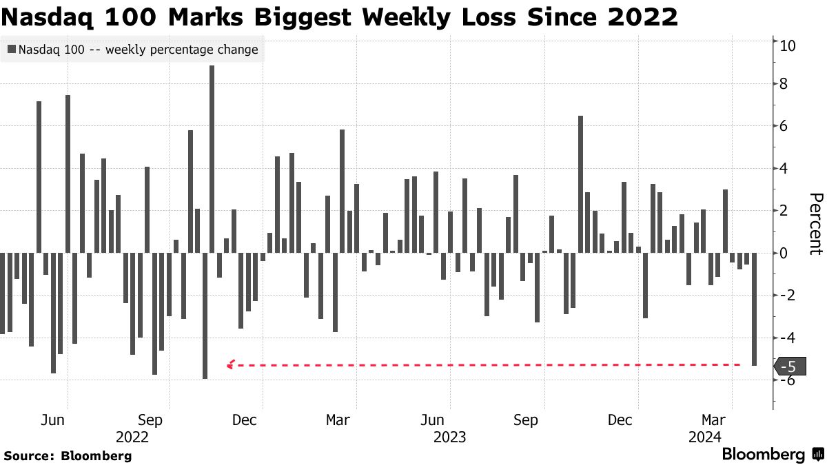 标普500指数收盘下跌0.9%,连续第六个交易日下跌,连续第三周下跌,使其比3月28日的收盘高点低超过5%。纳斯达克100指数下跌2.1%,录得自2022年11月以来最深的周跌幅。芝加哥期权交易所波动率指数接近19。科技巨头Nvidia Corp.、Meta Platforms Inc.和Amazon.com Inc.是周五两个股指下跌的最大贡献者。