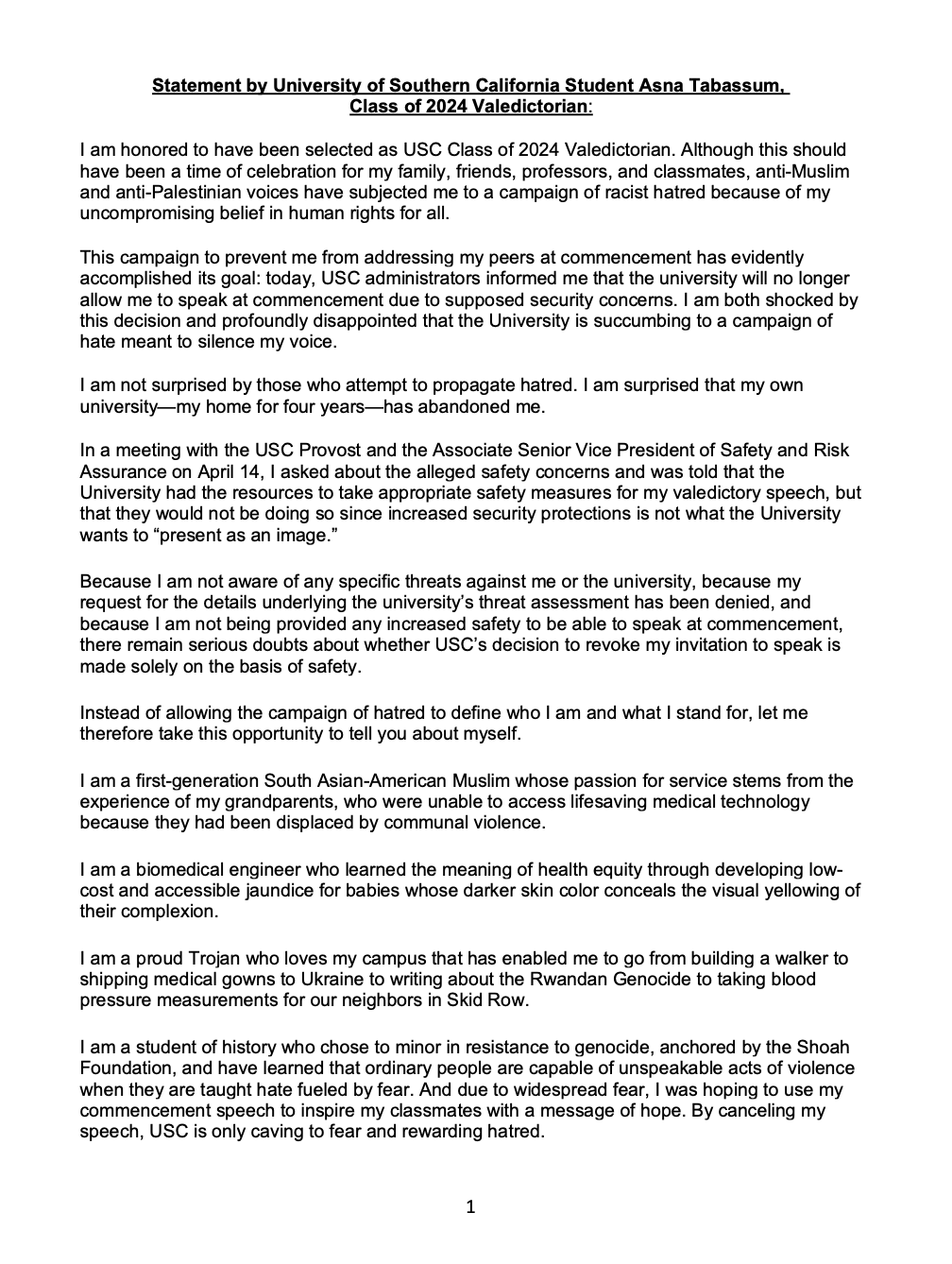 周一,南加州大学官员称取消Tabassum计划中的演讲是出于安全考虑。他们否认这一决定与她在社交媒体上批评以色列并支持巴勒斯坦人有关。穆斯林和南亚裔的Tabassum在声明中指责大学抛弃了她,这篇声明发布在美国伊斯兰关系理事会洛杉矶分会的网站上。