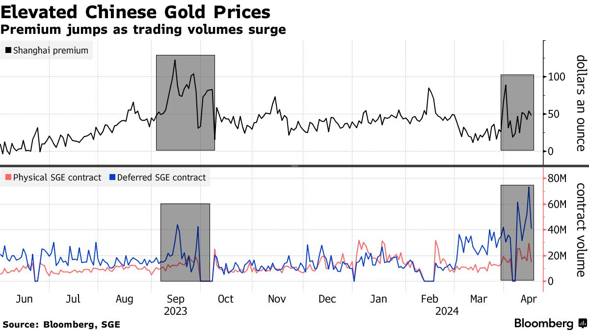 作为主要进口国,中国的黄金买家经常不得不支付高于国际价格的溢价。这在本月初跃升至每盎司89美元。过去一年的平均值为每盎司35美元,而历史平均值仅为7美元。