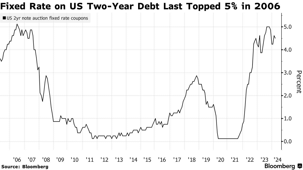 上周两年期国债收益率约为4.99%,因此周二的拍卖有机会首次自去年以来达到至少5%的票面利率。在此之前,投资者已经超过十年没有看到过这样的水平。