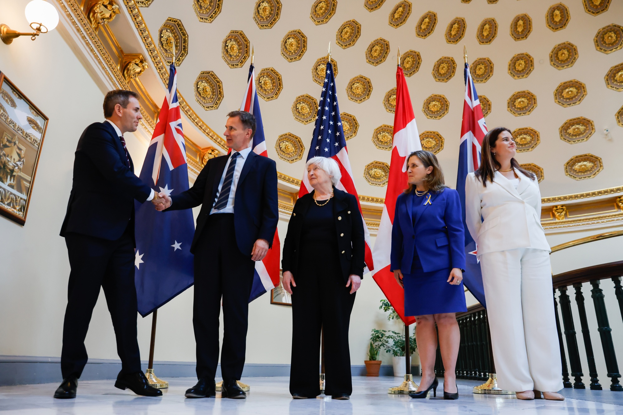 吉姆·查尔默斯,澳大利亚财政部长,英国财政大臣杰里米·亨特,美国财政部长珍妮特·耶伦,加拿大副总理兼财政部长克里斯蒂娅·弗里兰和新西兰财政部长尼古拉·威利斯,参加了华盛顿举行的五眼联盟财政部长会议,时间是4月18日。