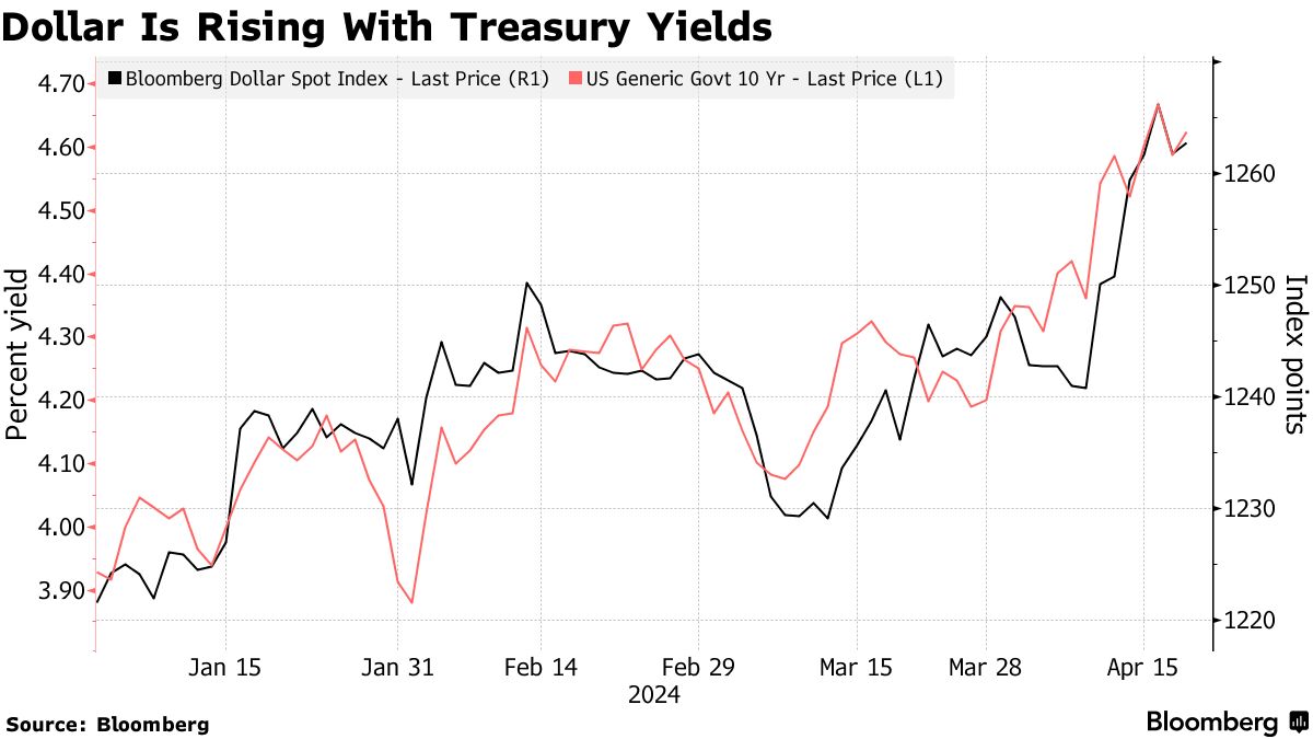 随着市场对美联储放松政策的押注减少,最近几周国债收益率再次飙升,将基准收益率推至接近5%。这一激增是美元吸引力的主要推动因素,美元还受益于在人工智能狂热中不断流入美国股市。