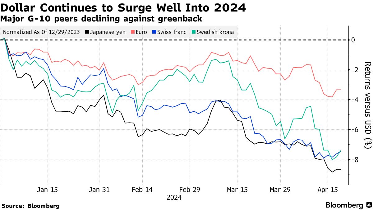 美元的复苏是基于一系列迹象,表明美国经济避开了许多人预期的放缓。劳动力市场保持紧张,制造业活动继续扩张。由此导致的通货膨胀持续性使美联储主席杰罗姆·鲍威尔和其他决策者比预期更迟迟未能降息。等待更长时间。