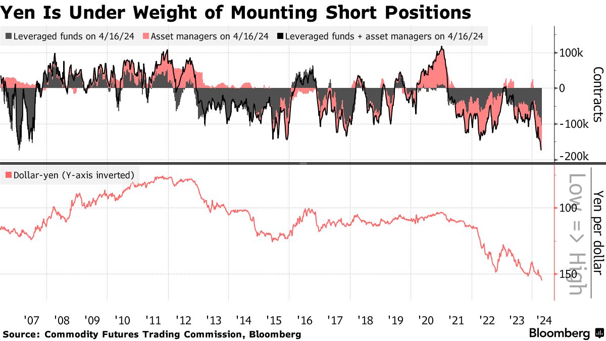 通过4月16日,杠杆基金和资产管理公司对日元贬值的押注增加到超过173,000份合约,创下了自2006年以来美国商品期货交易委员会数据记录以来的最高水平。根据彭博计算,这也是九种主要货币中空头头寸最大的,使日元特别容易受到反弹的影响。